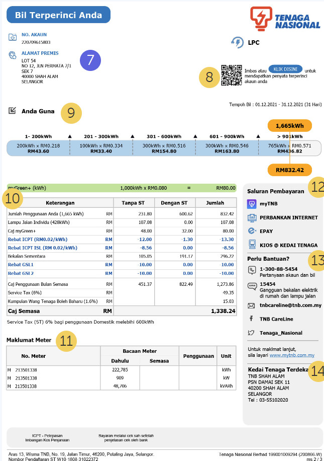 아래 TNB 전기요금 고지서 예시 그림을 참고하여 설명하도록 하겠습니다.