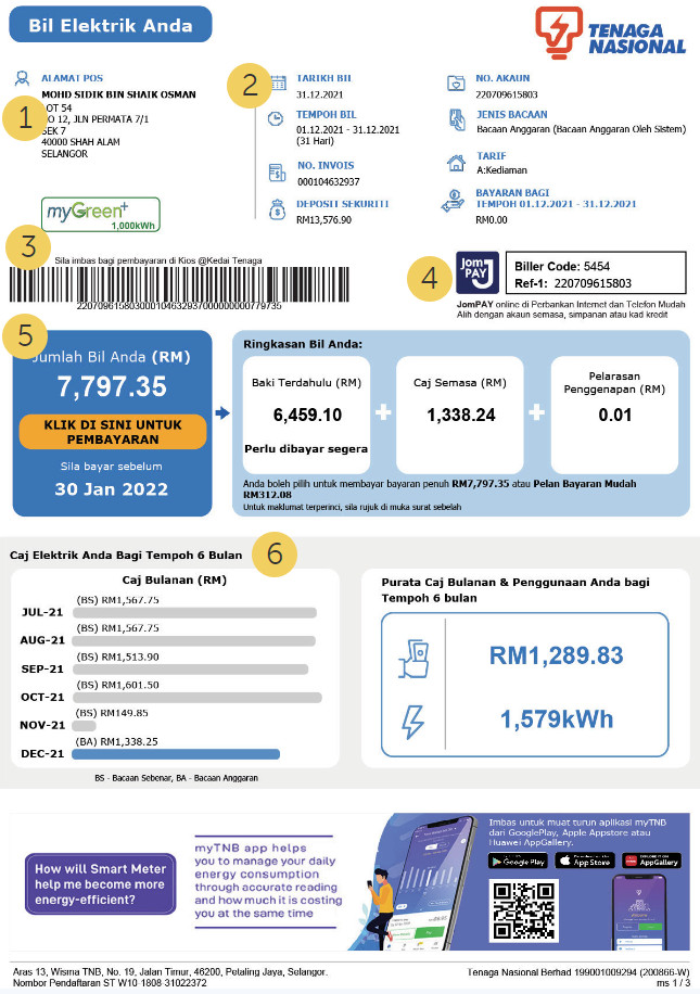아래 TNB 전기요금 고지서 예시 그림을 참고하여 설명하도록 하겠습니다.
