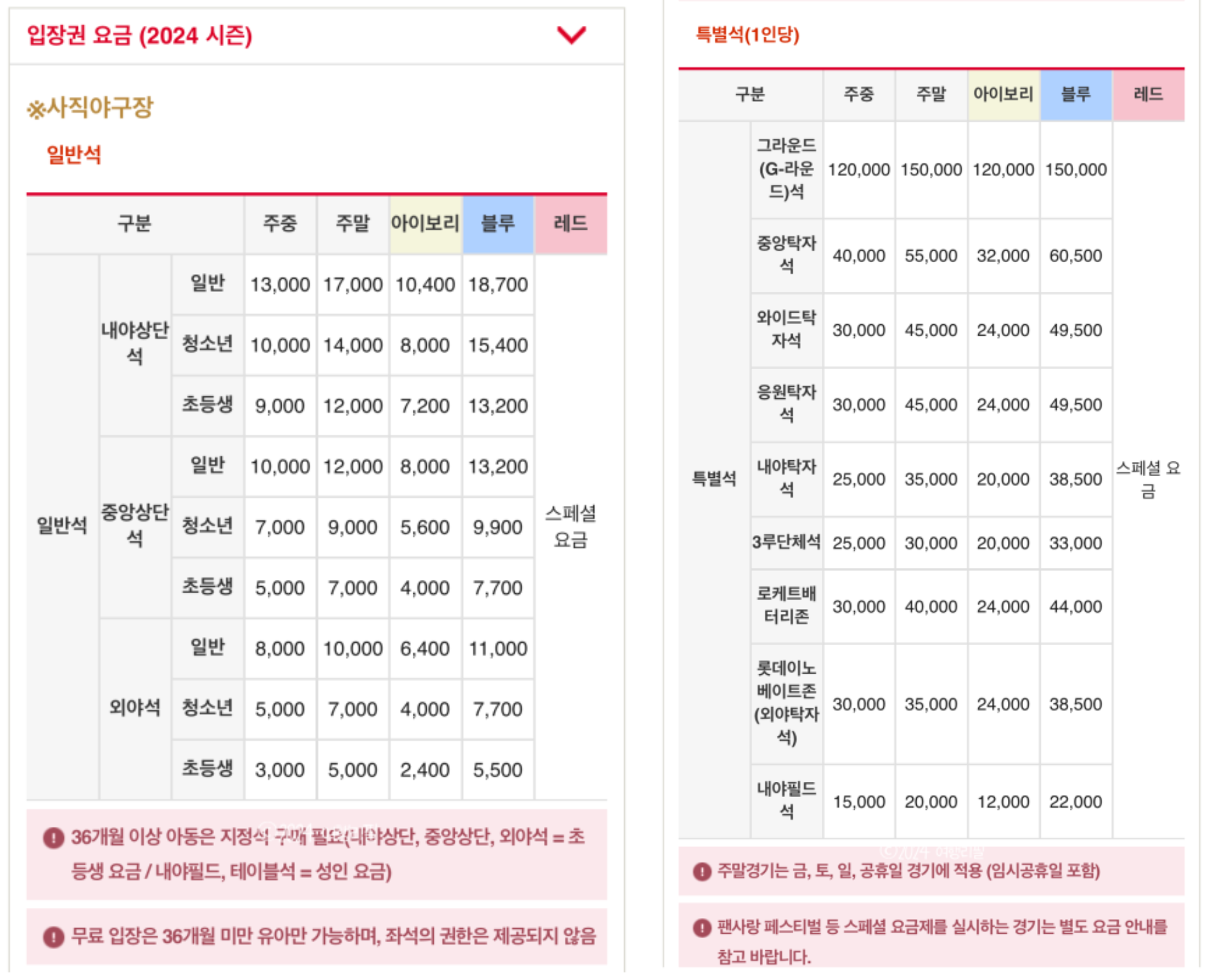 아직은 좌석도 및 가격 관련 정보가 공지되지는 않았지만 2024시즌 사직구장 좌석 및 가격 정보는 아래 그림을 참고 바랍니다.