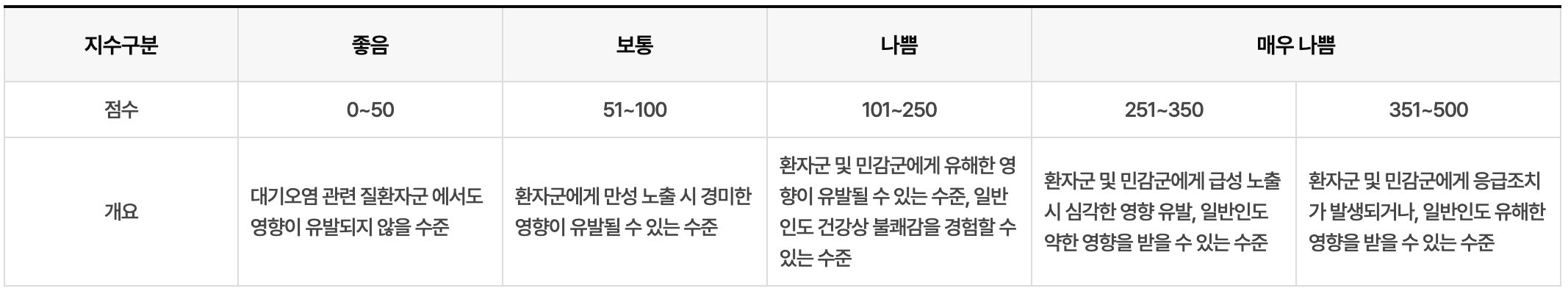 통합대기환경지수는 0에서 500까지의 지수를 4단계로 나누어 점수가 커질수록 대기상태가 좋지 않음을 나타냄.